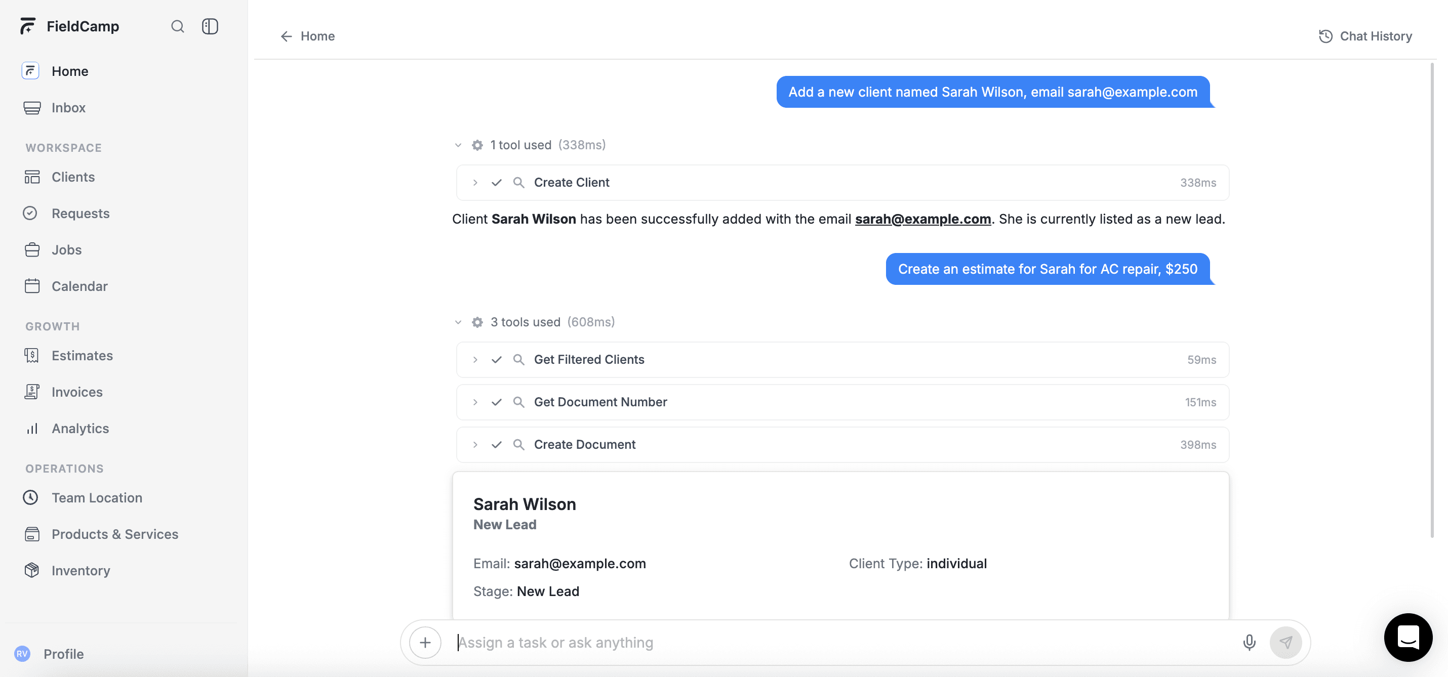 With the Command Centre: Type "Create an estimate for Sarah for AC repair, $250" and the AI builds and sends it.