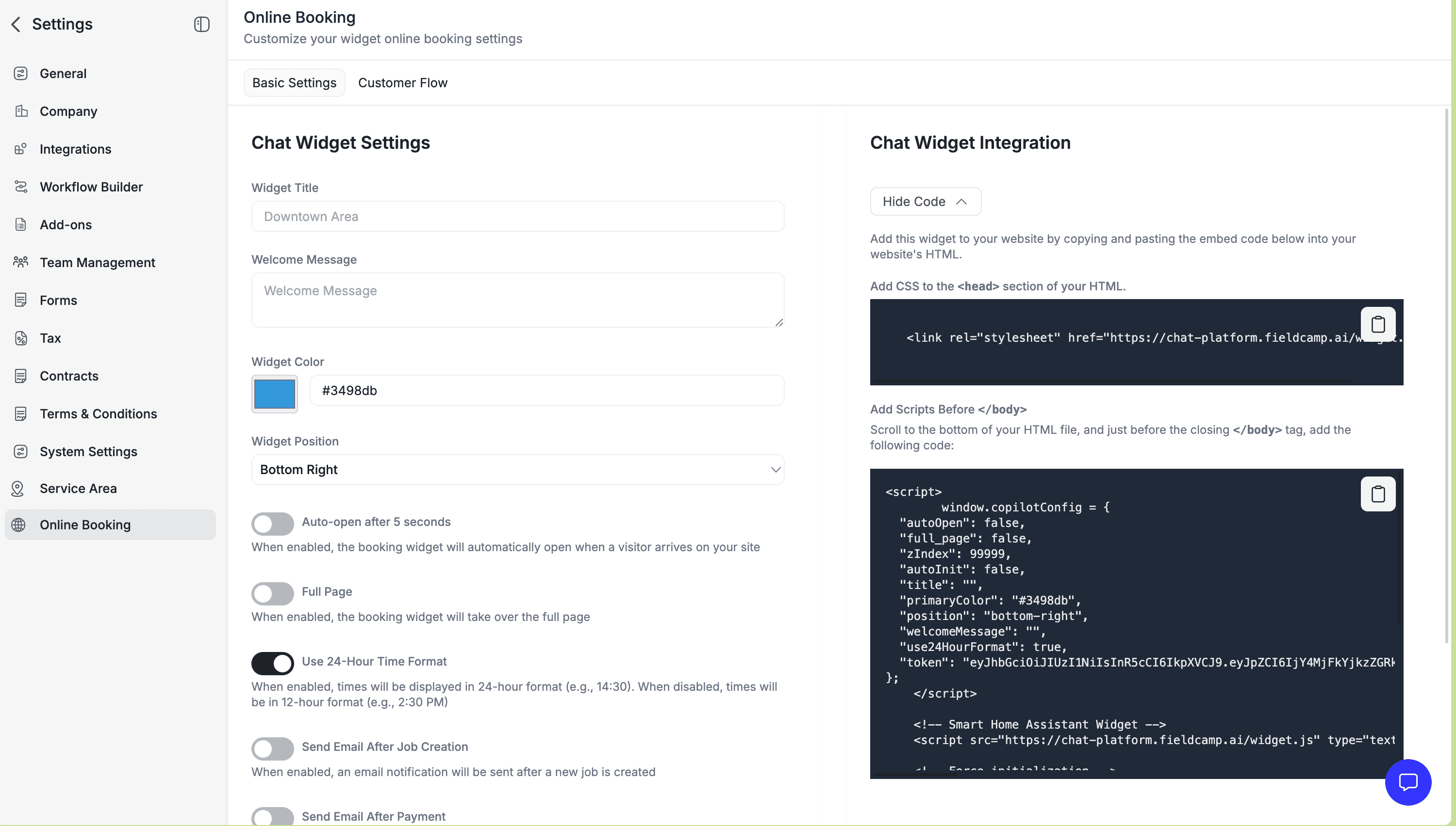 Embed FieldCamp's online booking widget on your website to let customers book services 24/7. Step-by-step install guide for WordPress, Wix, Squarespace, and Shopify.