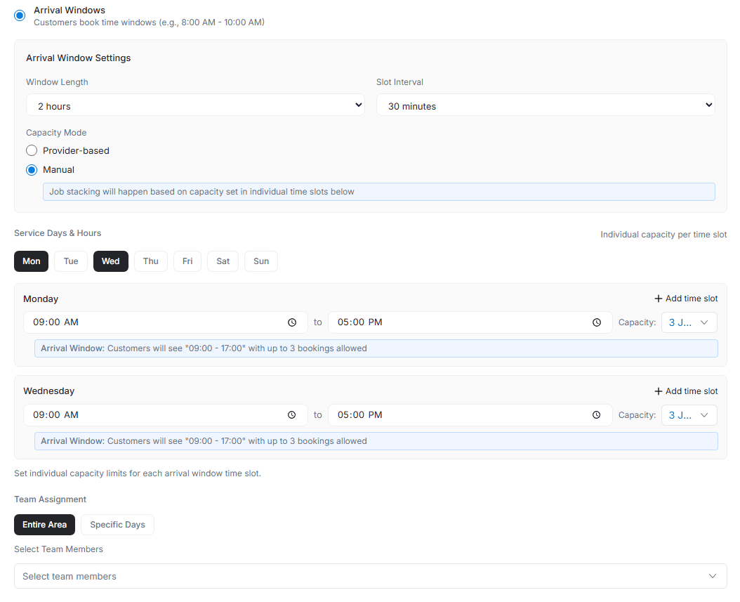 Manual capacity is one of three scheduling formats available in FieldCamp. If you prefer the system to calculate capacity automatically based on your team size, see Arrival Windows with Provider-Based Capacity. For exact appointment times instead of windows, try Fixed Time Scheduling.
