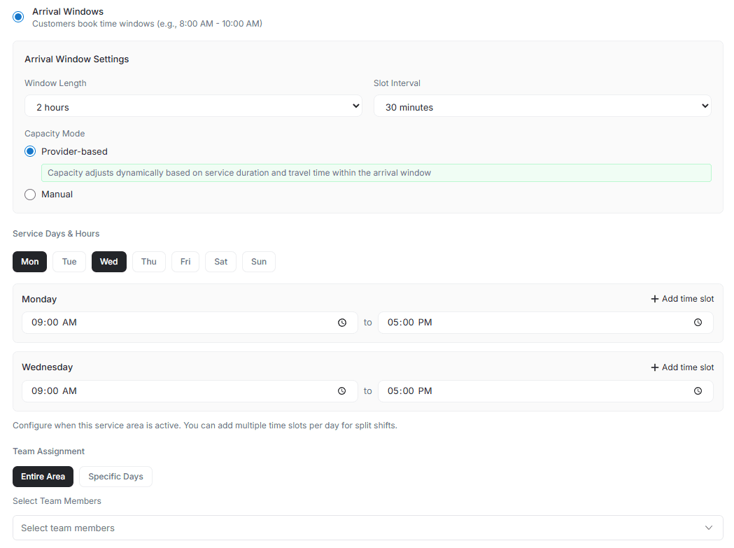 Provider-based capacity automatically calculates how many jobs fit in each arrival window based on service duration, travel time, and team availability. This is the best option for businesses that want intelligent, hands-off scheduling that adapts as your team and bookings change.